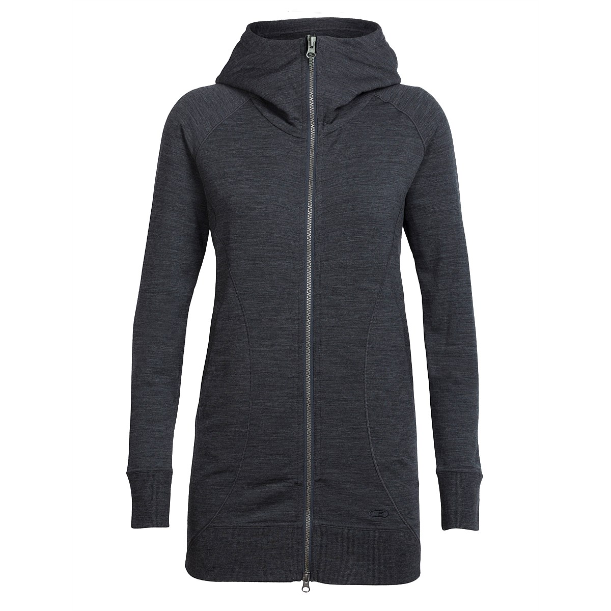 The Dia Long Hooded Jacket combines ultra-soft terry RealFLEECE? fabric with a unique and flattering silhouette for the perfect before and after comfort piece. Our merino-blend RealFLEECE features a touch of LYCRA? for stretch, as well as our Corespun fibers?nylon threads wrapped in merino wool for added durability that retains next-to-skin softness. The relaxed hood and long length adds warmth on your way to yoga or while relaxing after a long day of skiing, and two side pockets keep your hands toasty on chilly evenings. The raglan sleeves provide additional mobility and the metallic finish on the two-way front Vislon zipper adds unique style.