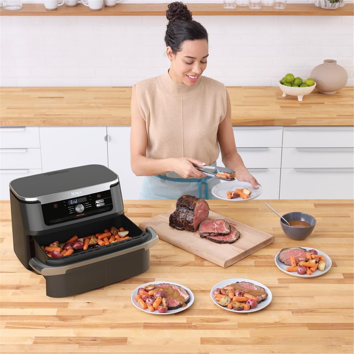 Meet the Ninja XXXL FlexDrawer Air Fryer with 10.4 L MegaZone. With the MegaZone, you can now cook larger proteins or entire meals that feed your whole family all in one drawer. Insert the draw divider to cook with two 5.2 L drawers or remove it to cook in 1 MegaZone for full 10.4 L capacity. Eliminate back-to-back cooking with DualZone Technology. Use Smart Finish to cook 2 foods, 2 ways that finish cooking at the same time, or Sync the settings across both zones with Match Cook. Plus, this Ninja Air Fryer comes with 7 cooking functions, so no matter what you’re craving, you can make it all in this extra-large air fryer.
