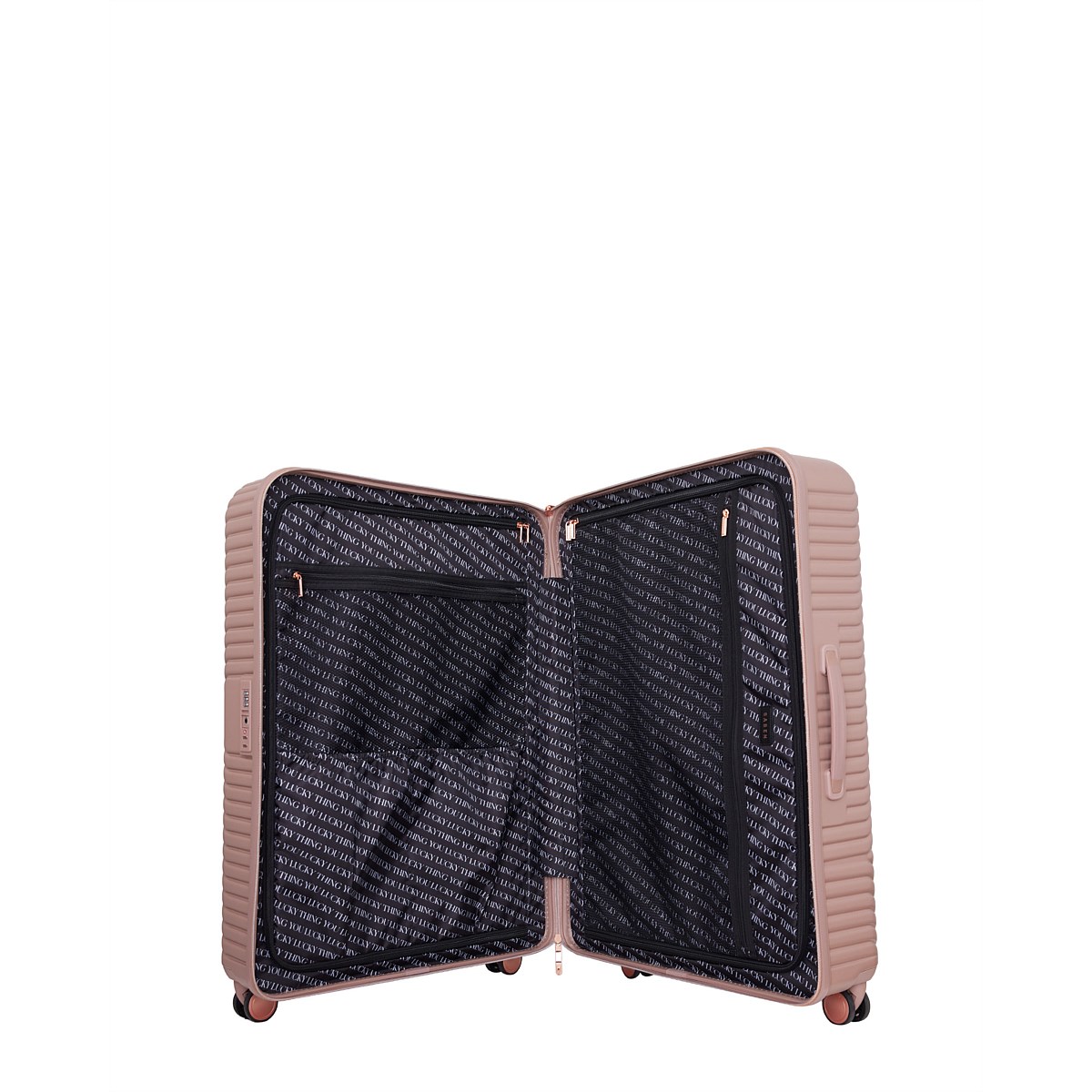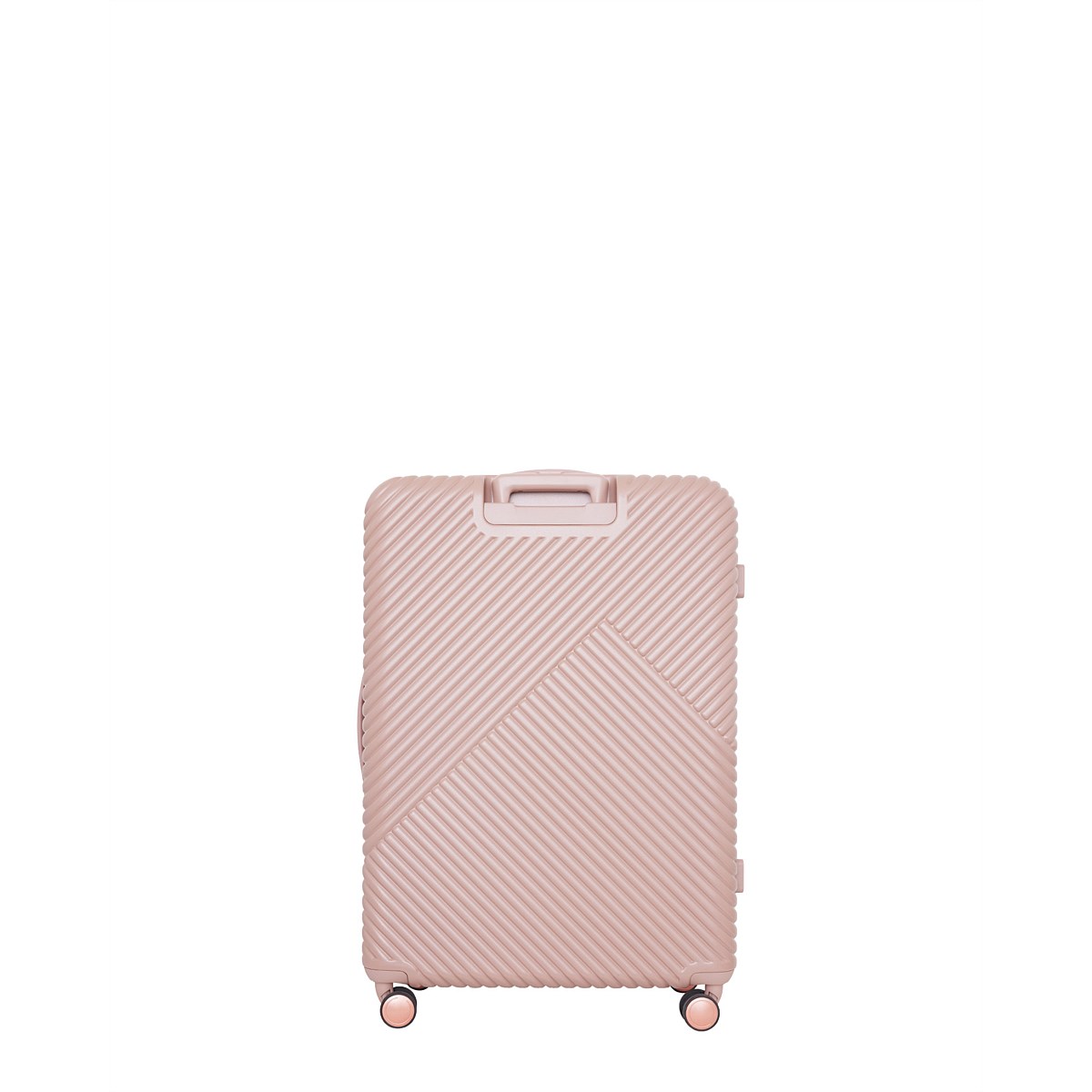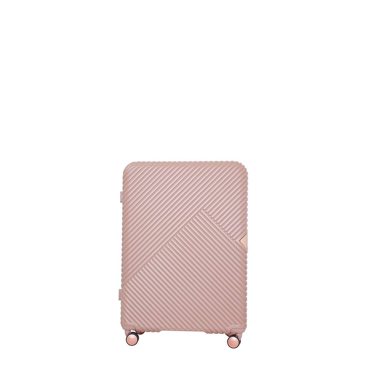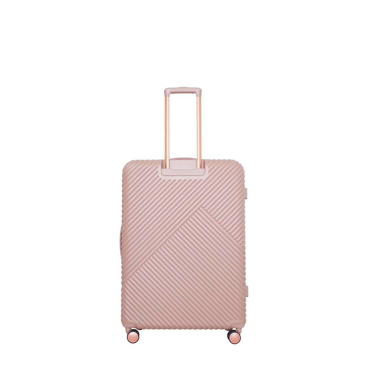 Made from moulded polycarbonate with metallic rose gold detailing for a lightweight and robust construction. It features a comfortable multi stage, retractable handle for easy manoeuvrability and a 360 degree dual spinner wheel system that smoothly glides in any direction.