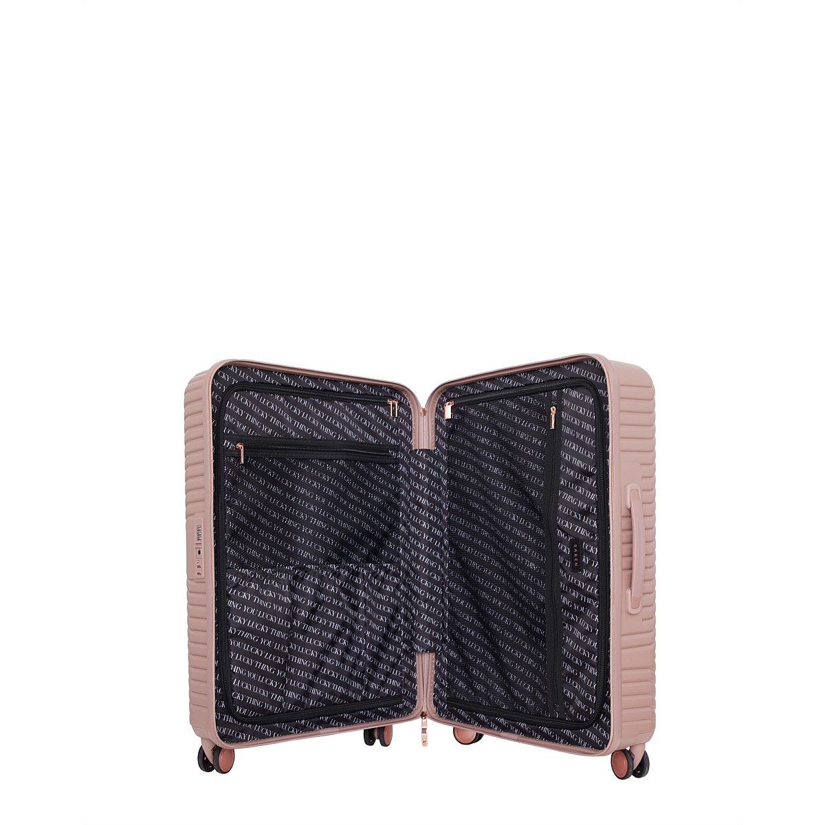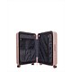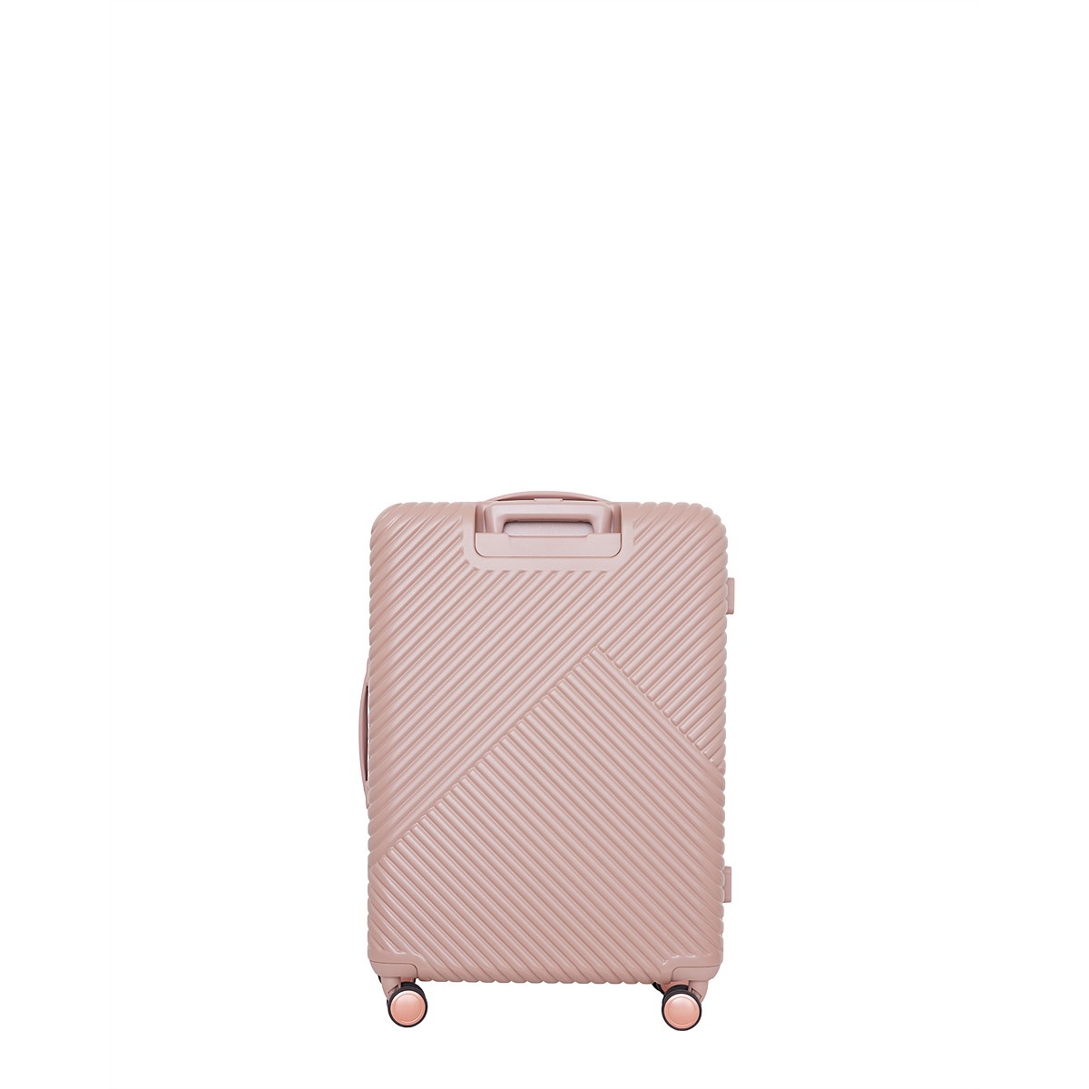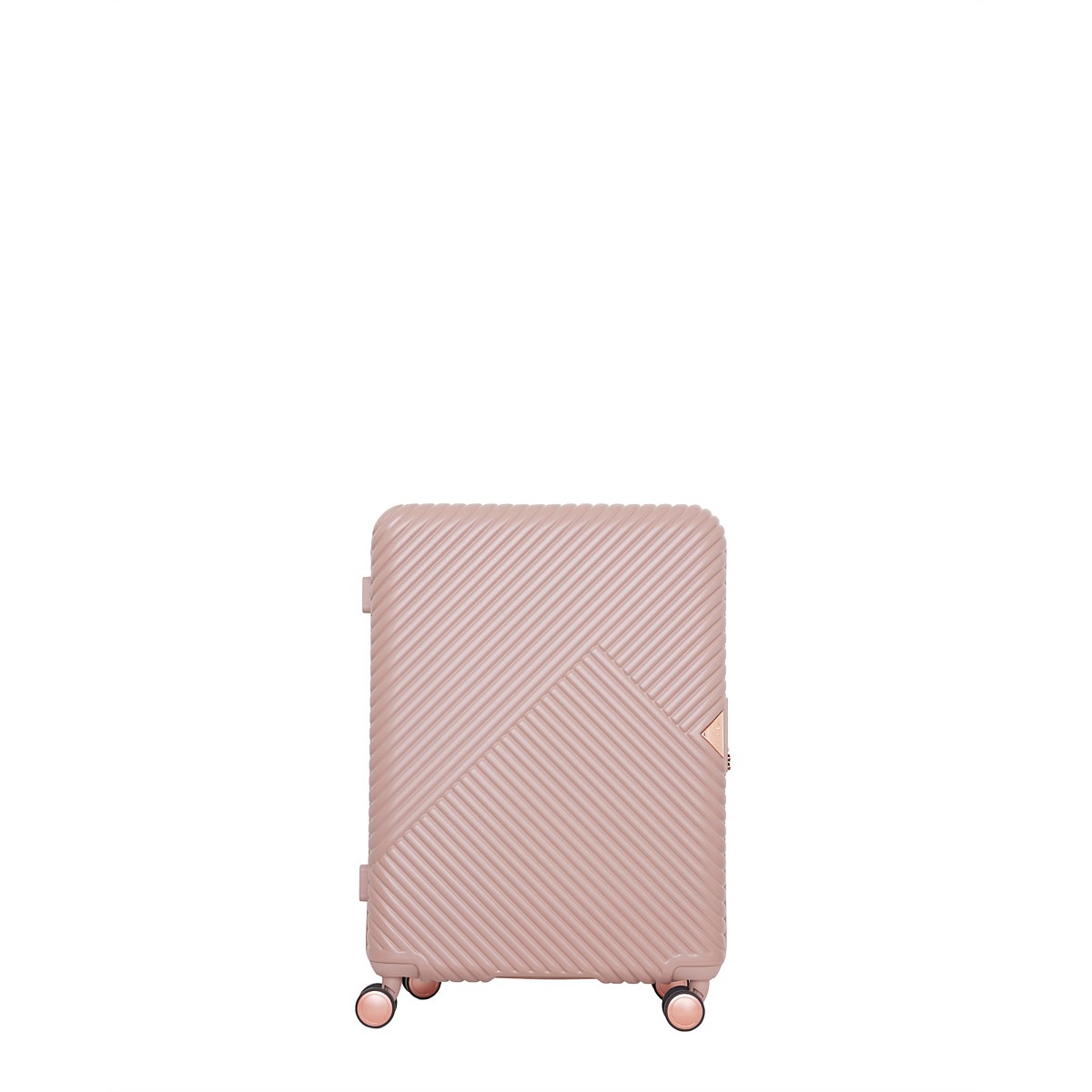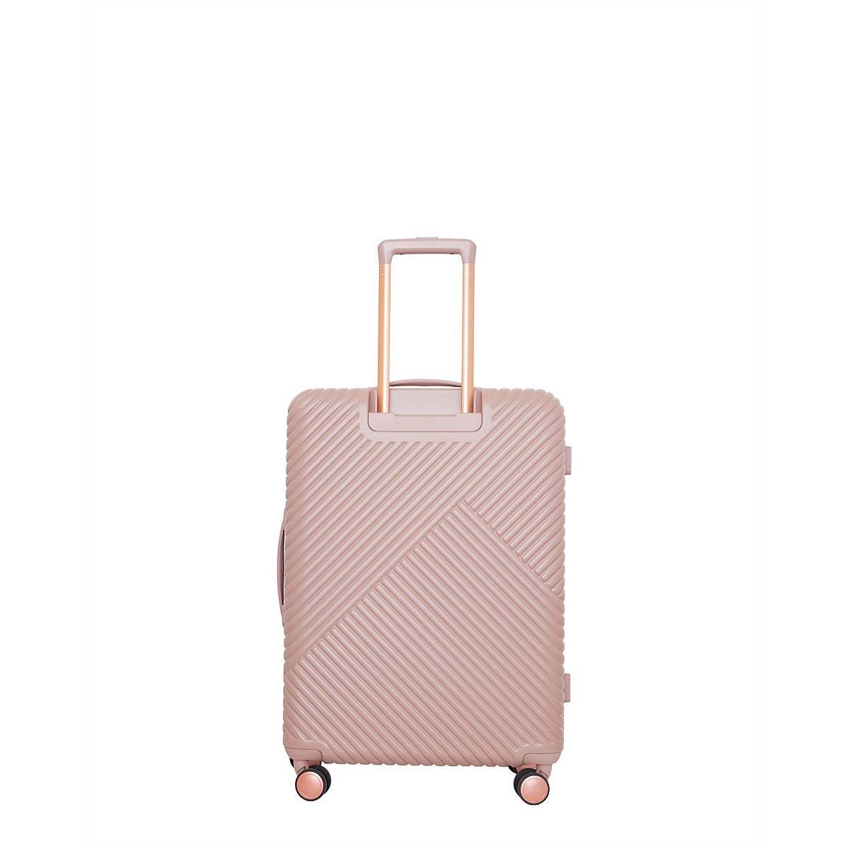 Made from moulded polycarbonate with metallic rose gold detailing for a lightweight and robust construction. It features a comfortable multi stage, retractable handle for easy manoeuvrability and a 360 degree dual spinner wheel system that smoothly glides in any direction.